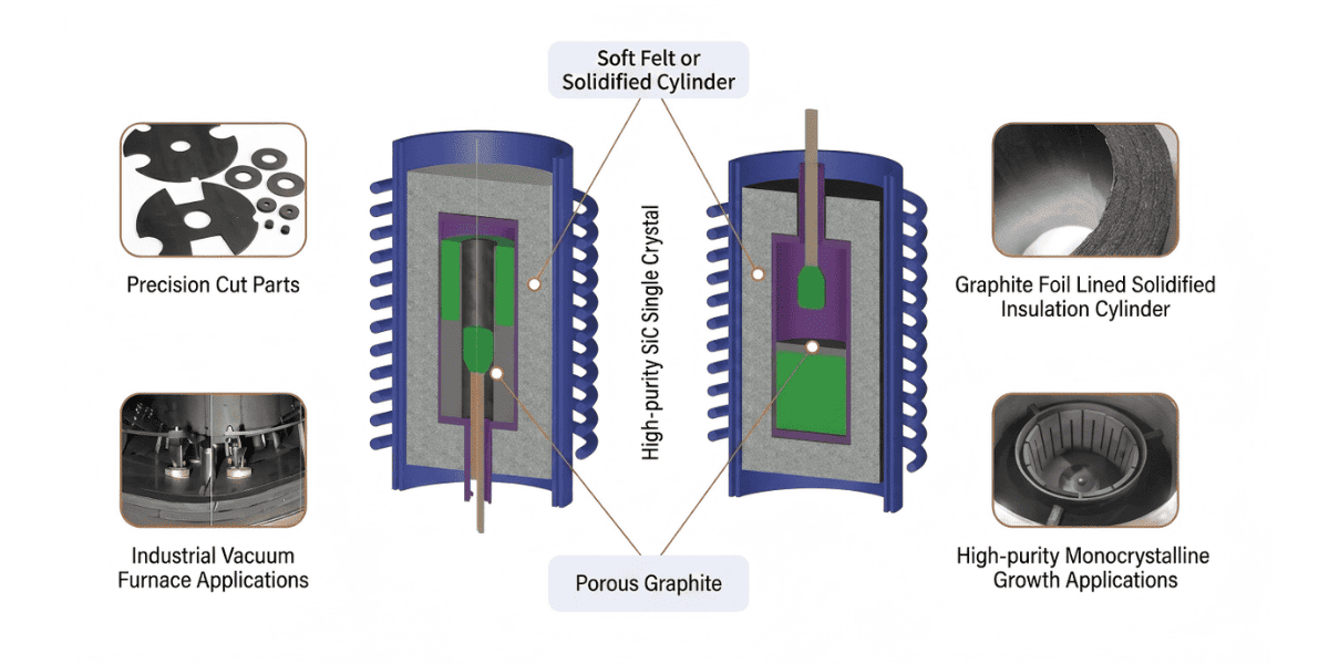 Sản xuất chất bán dẫn:Đây là lớp cách nhiệt quan trọng cho các thiết lập lò tăng trưởng tinh thể silicon và tinh thể SiC đơn tinh thể.